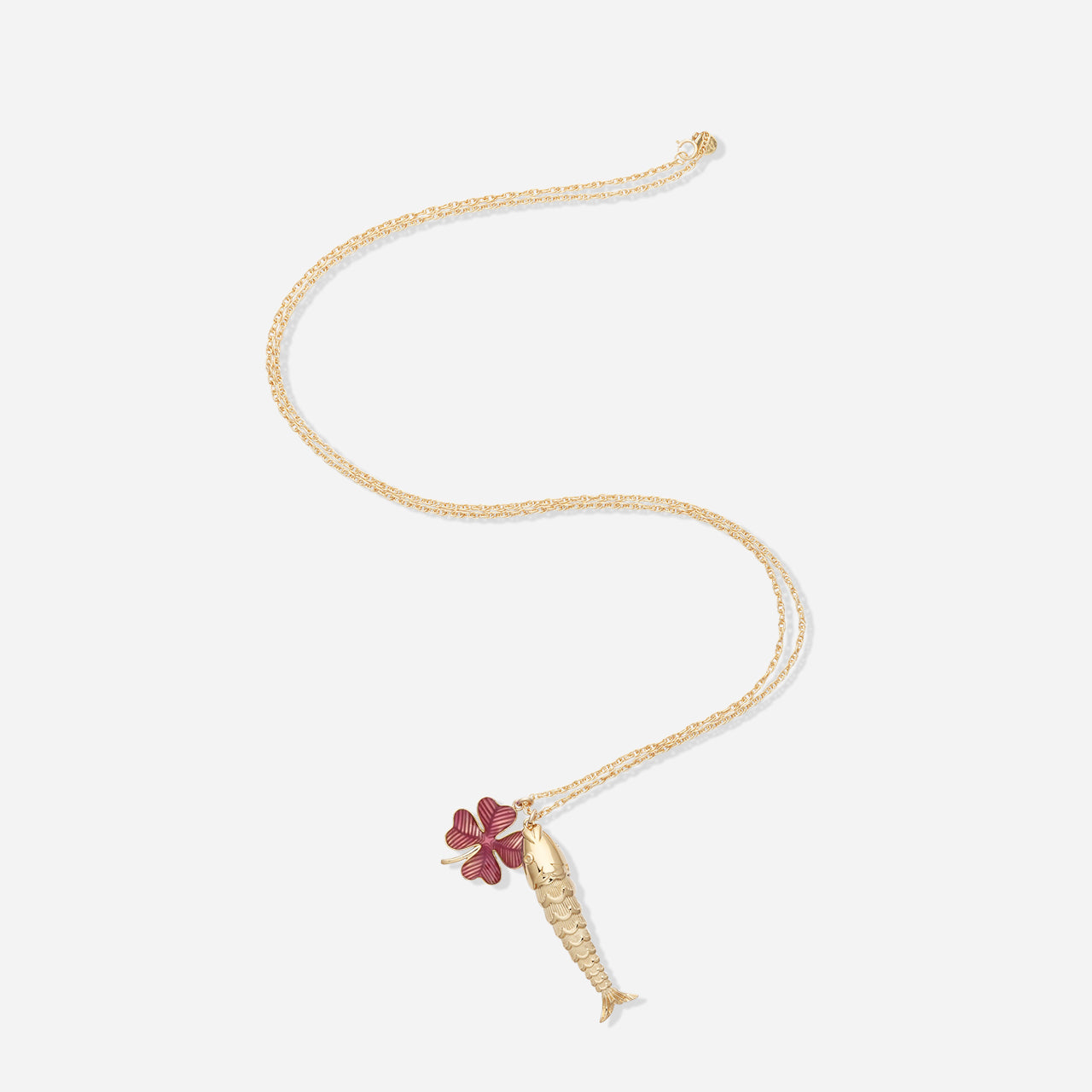 The Nemo long necklace consists of a colored enameled clover, 2cm in diameter, and a 5.5cm long articulated fish in 18ct gold-plated brass.