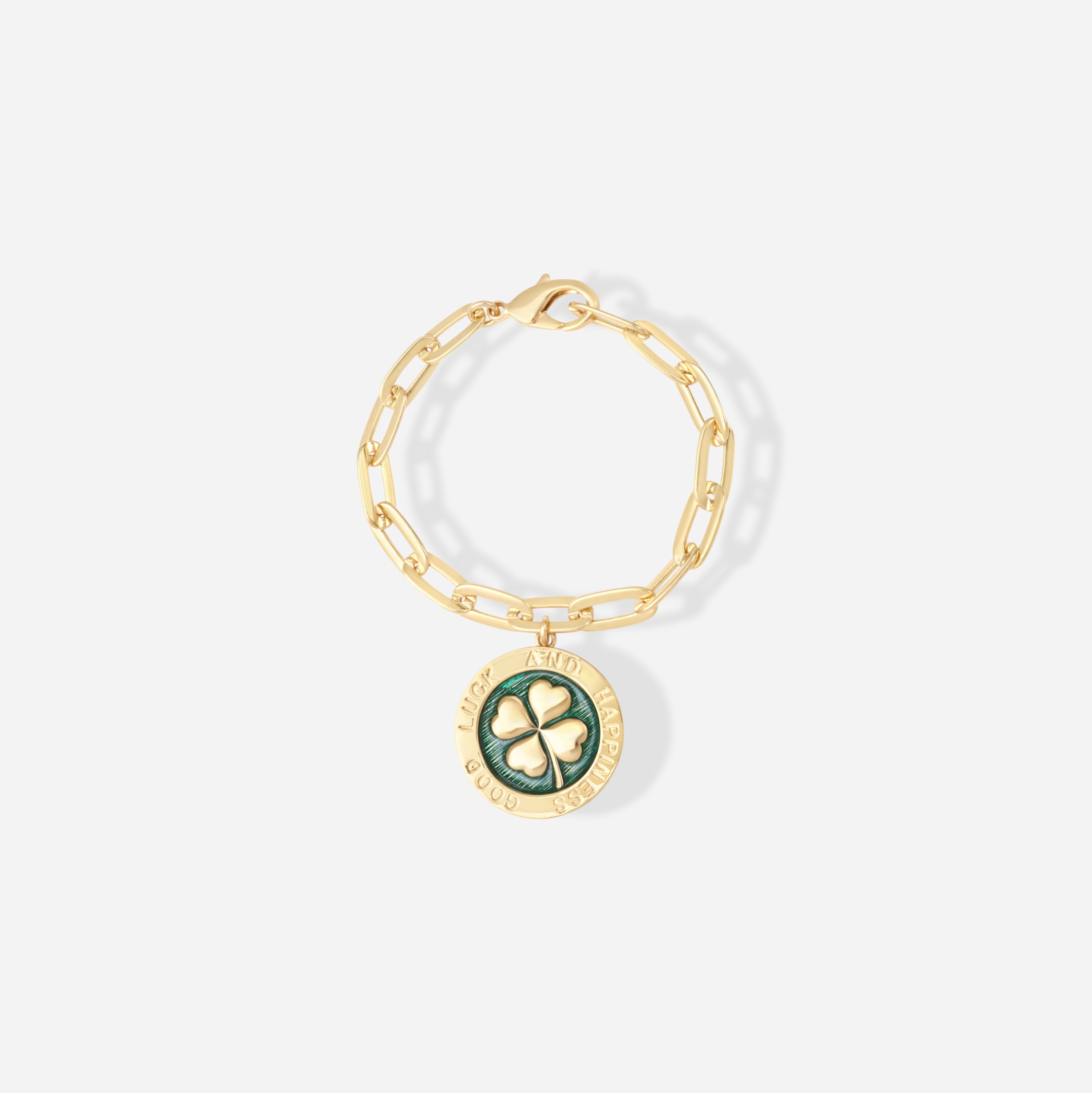 Le bracelet Shamrock est composé d'une chaine gourmette à larges maillons qui mesure 17cm et d'une médaille émaillée de 3cm de diamètre, avec un trèfle doré en relief au centre et du message "good luck and happiness" autour.