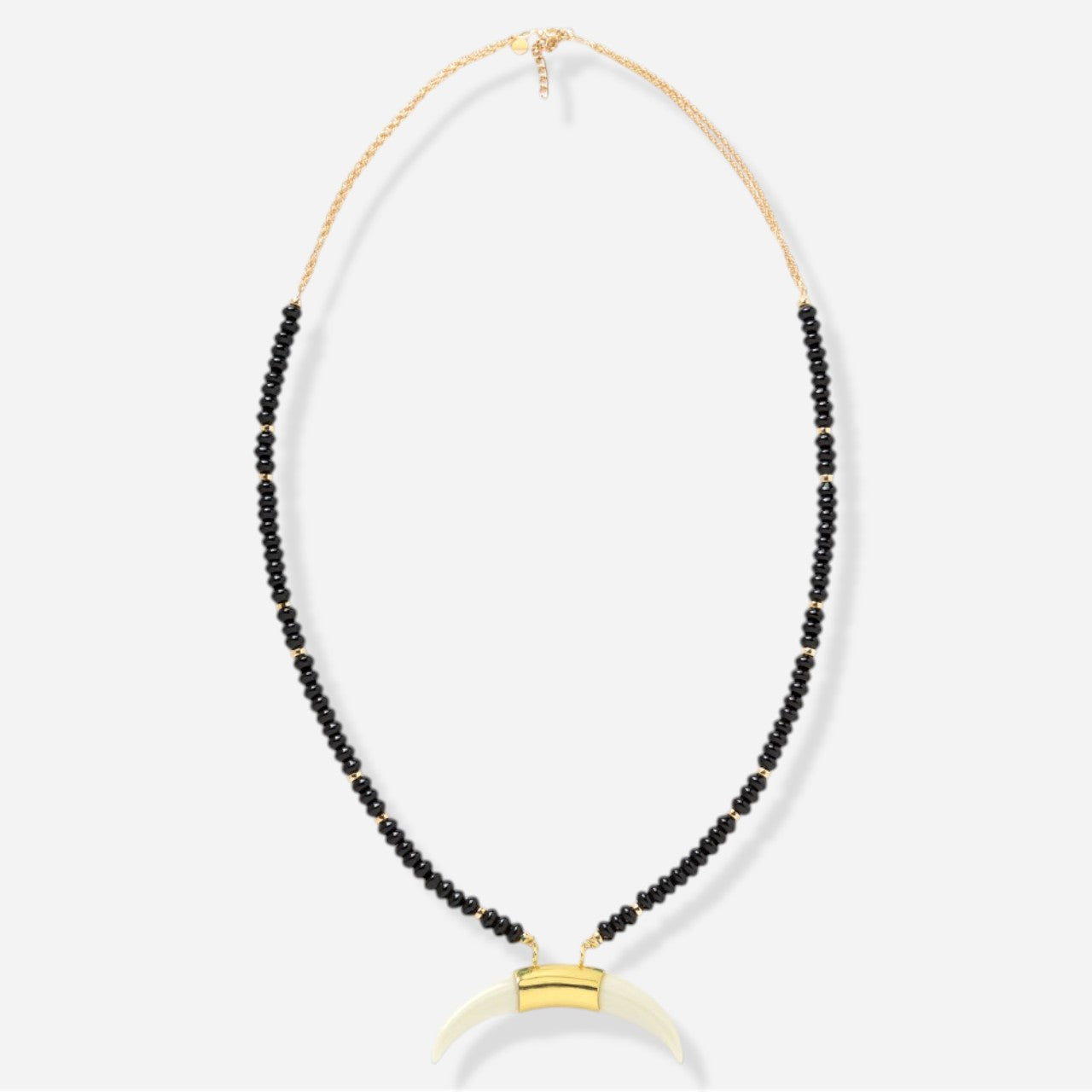 Le collier Impact se compose de deux défenses en bakélite ivoire, mesurant 7cm, et de perles en onyx.